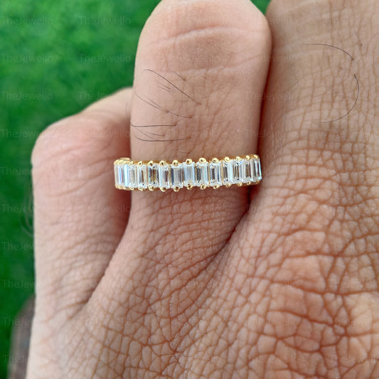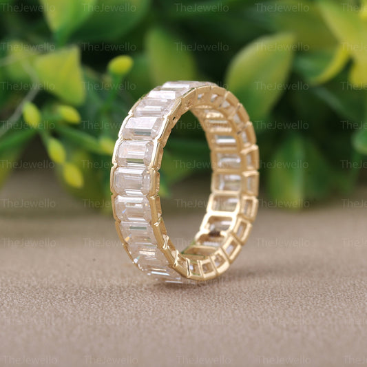 Moissanite Emerald Ring, Half Bezel Style Set Band, Full Eternity Wedding Band, 18k Solid Gold ring, Emerald Cut Moissanite Colourless Band