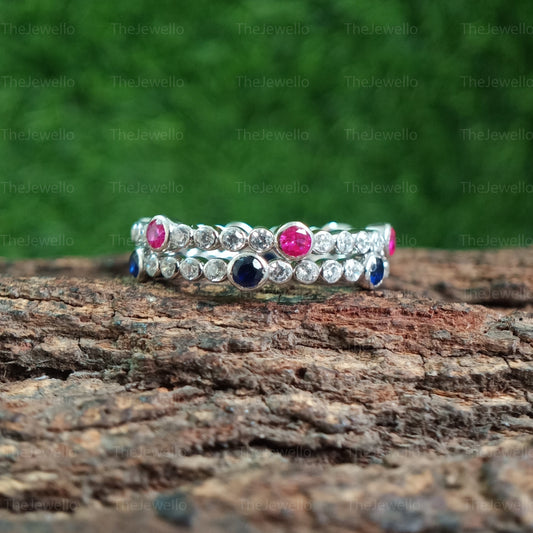 Set of 2 Moissanite Wedding Band, Full Eternity Bezel Wedding Band, Ruby and Sapphire Engagement Band Ring, 925 Sterling Silver Rings