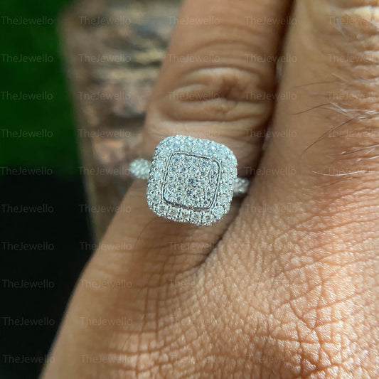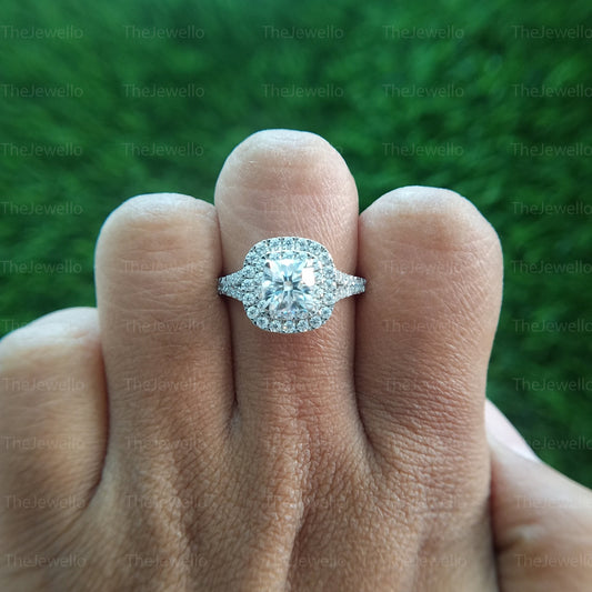 Cushion Cut Moissanite Ring, Double Halo Solid White Gold Engagement Ring, Split Shank 925 Sterling Silver Ring