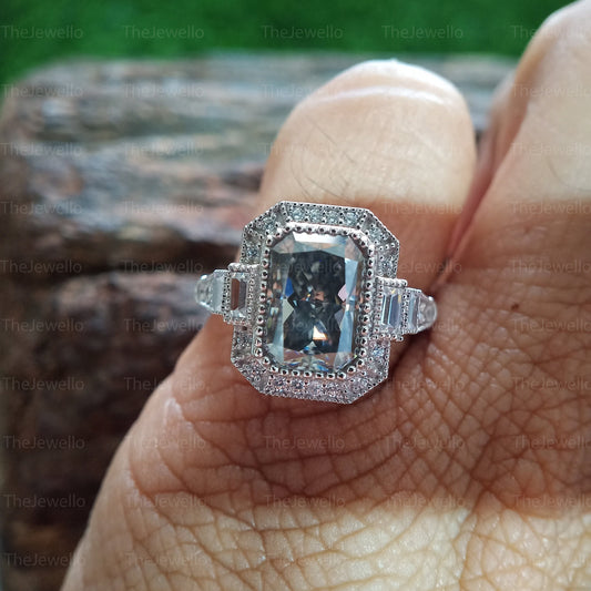 10x7mm Radiant Cut Gray Moissanite Halo Engagement Ring, Vintage Grey Moissanite Engagement Ring, Baguette Diamond in Halo