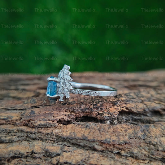 Natural Aquamarine Engagement Ring, Round Cut Aquamarine Birthstone Ring, Moissanite Marquise Wine Motif Style Ring