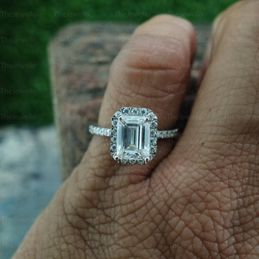 1.55ct Emerald Cut Halo Moissanite Ring, Emerald Cut Moissanite Wedding Ring, Halo Womens Anniversary Gift Ring