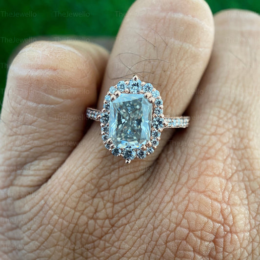 Antique Vintage Style 3.74 TW Radiant Cut Grey Moissanite Ring, Halo Engagement Ring, Double Claw Prongs, Solid Rose/White/Yellow Gold Ring