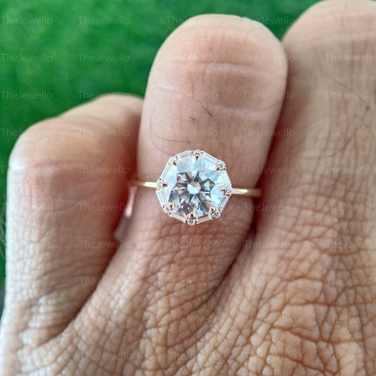 Round Cut Colorless Moissanite Ring, Pave Set Hidden Halo Engagement Ring, Halo Baguette Moissanite Ring, Anniversary Gift Ring
