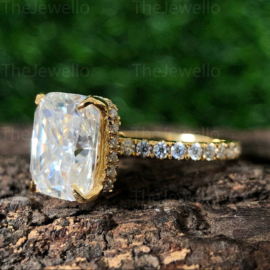 18k Yellow Gold Cushion Moissanite Ring, Elongated Cushion Cut Engagement Ring, Solitaire Hidden Halo Long Cushion Cut Moissanite Ring