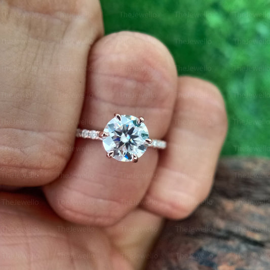 1.50ct Round Moissanite Engagement Ring, Invisible Hidden Halo Donut Ring, Solid Rose Gold Moissanite Ring for Women