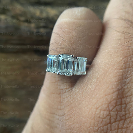2.20 TCW Three stone engagement ring,Emerald cut moissanite ring,18k/14k yellow gold,unique,trllies set three stone ring,wedding ring,women