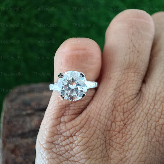 3.50 Carat Round Cut Moissanite Ring, Side Tapper Baguette Cut Ring, Three 3 Stone Moissanite Engagement Ring in 950 Platinum