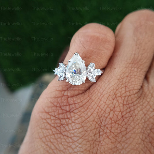 3.90ct Pear Cut Moissanite Engagement Ring 7 Stone Ring Marquise Accent Moissanite Diamond Ring Solid 14k White Gold Engagement Ring