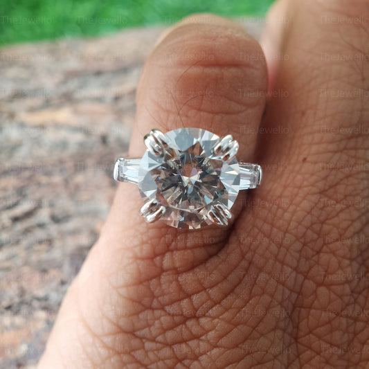 5Ct Round Cut Moissanite Ring, Three Stone Engagement Ring, Tapper Baguette Side Stone Moissanite Ring