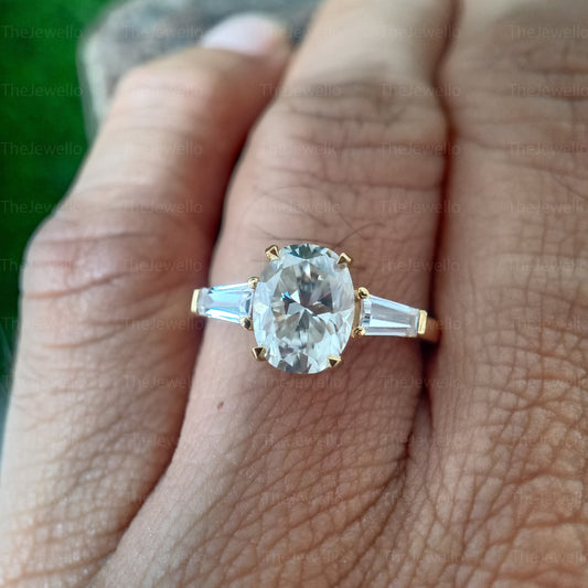 2.40 CT Oval Moissanite Engagement Ring, Three Stone Engagement Ring, Side Taper Baguette Cut Moissanite Ring, 18k Yellow Gold Ring