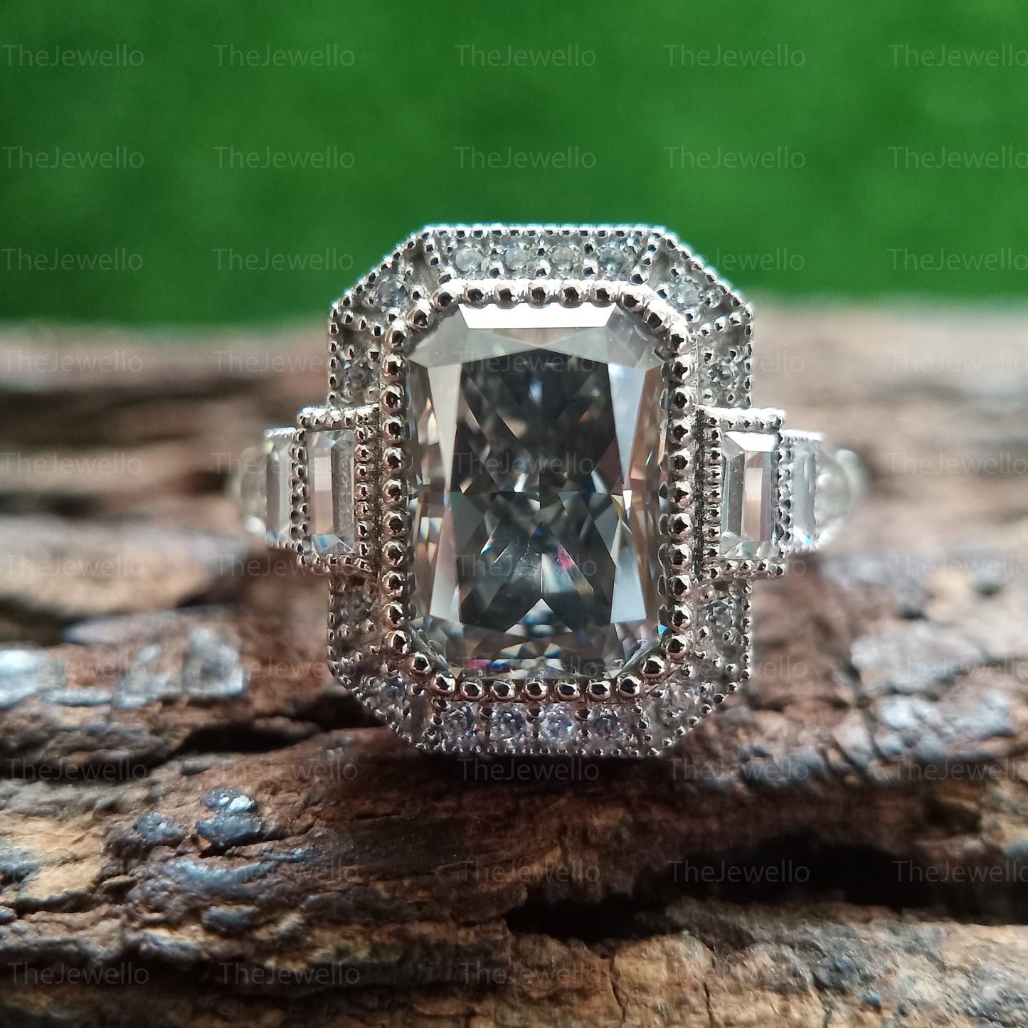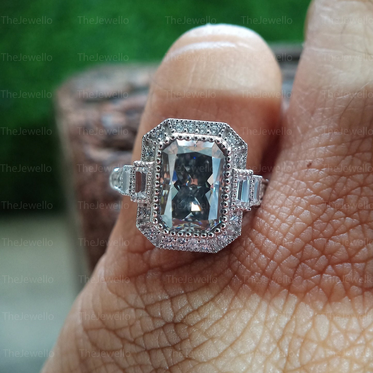 10x7mm Radiant Cut Gray Moissanite Halo Engagement Ring, Vintage Grey Moissanite Engagement Ring, Baguette Diamond in Halo
