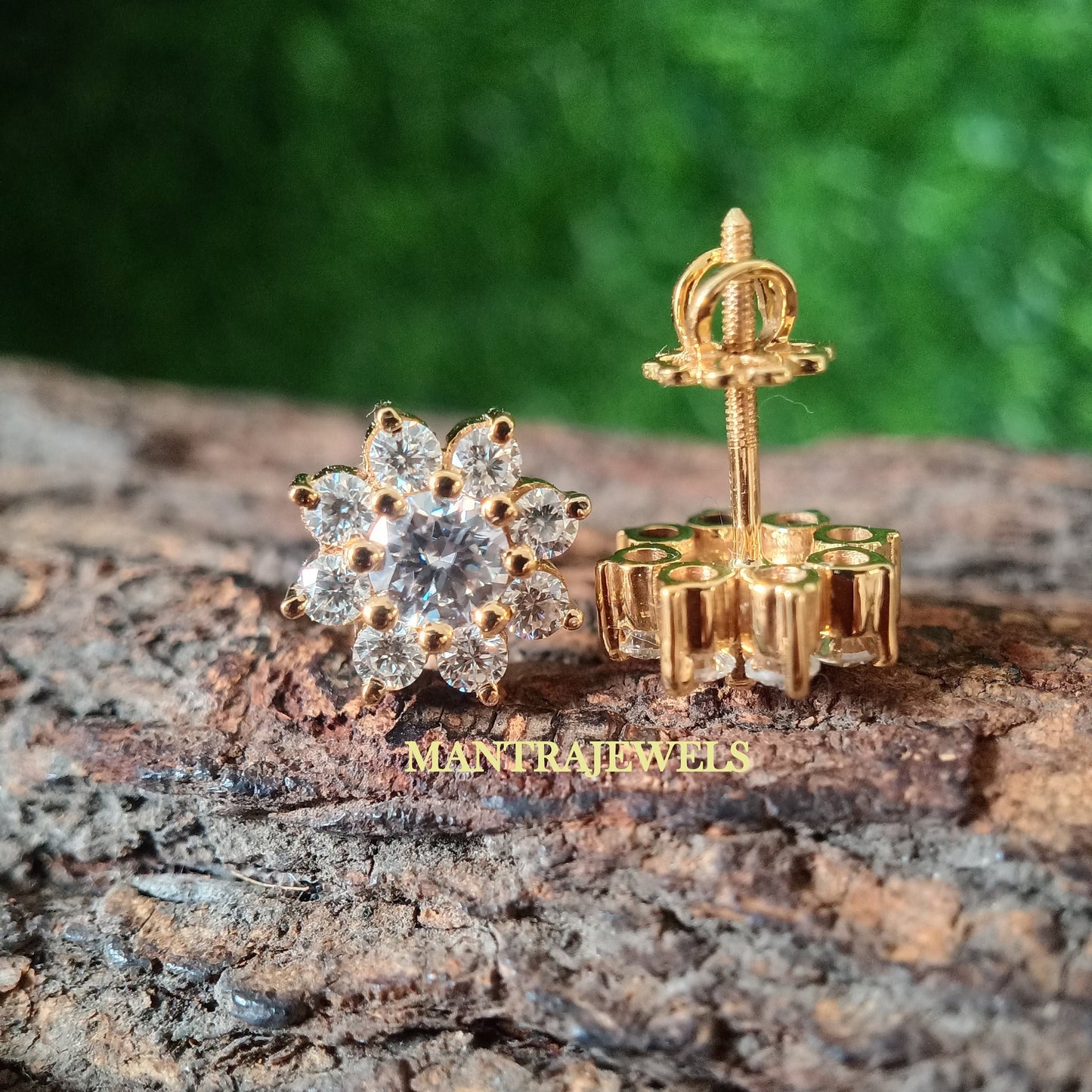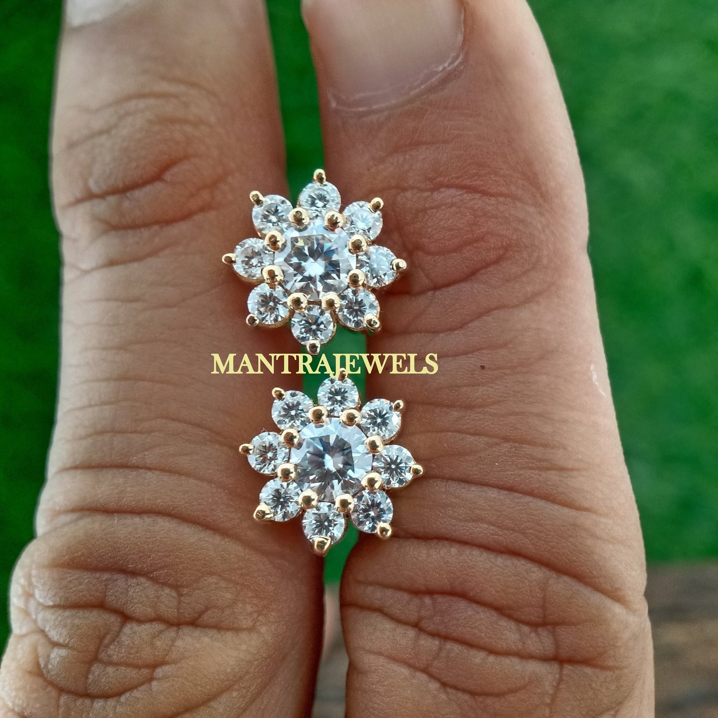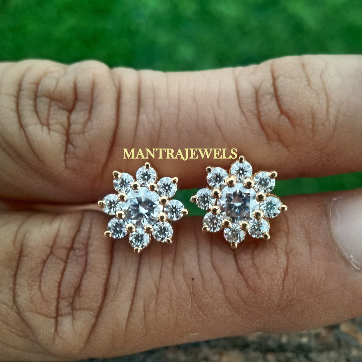 1.90 TCW Round Cut Colorless Moissanite Earrings, Flower Cluster Bridal Stud Earrings, Flower Style Wedding Earrings, Yellow Gold Earrings
