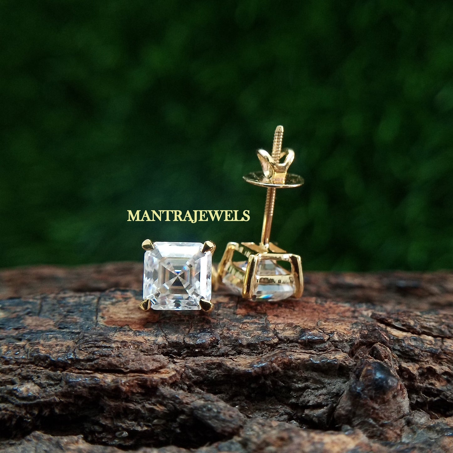 Asscher Cut Near Colorless Moissanite Stud Earrings, 10k/14k/18k Yellow Gold Diamond Earrings, Basket Prongs Solitaire Screw Back Earrings.