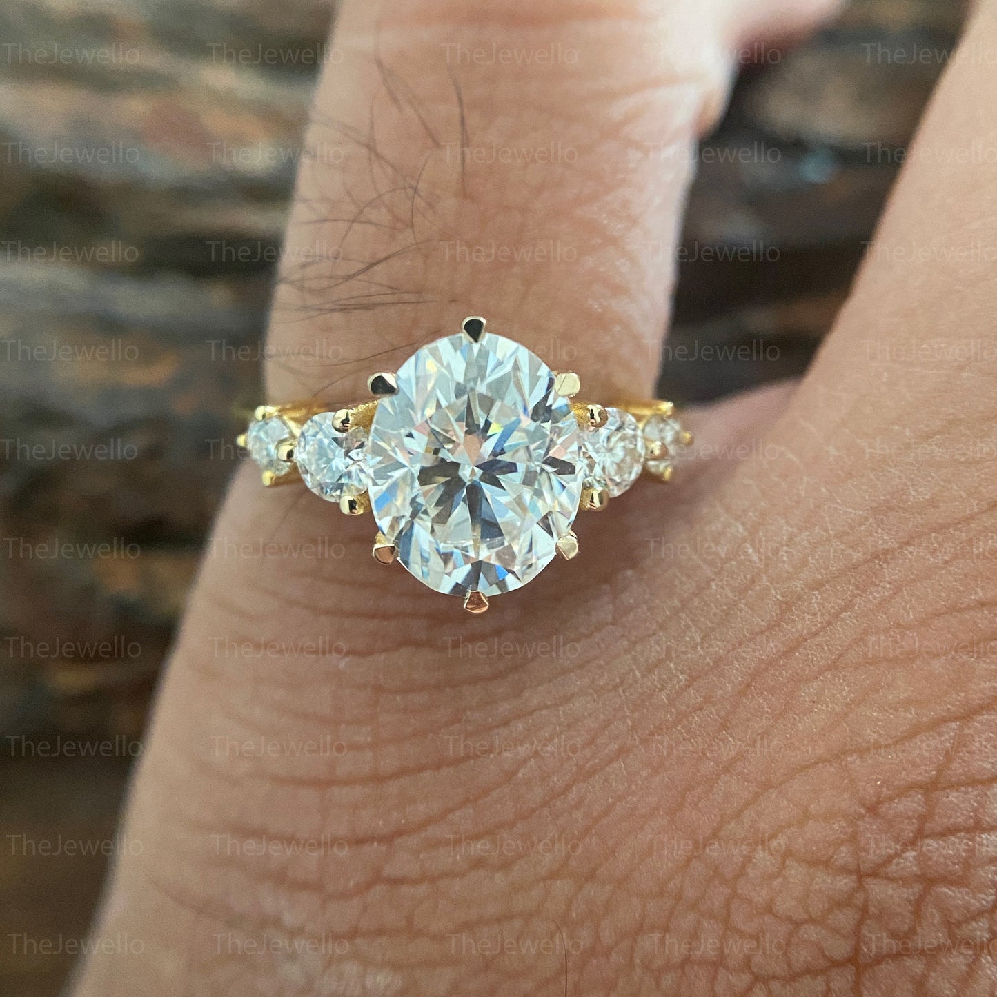 Oval Cut Moissanite Ring, Oval Yellow Gold Engagement Ring, Solitaire Round Accent Moissanite Engagement Ring