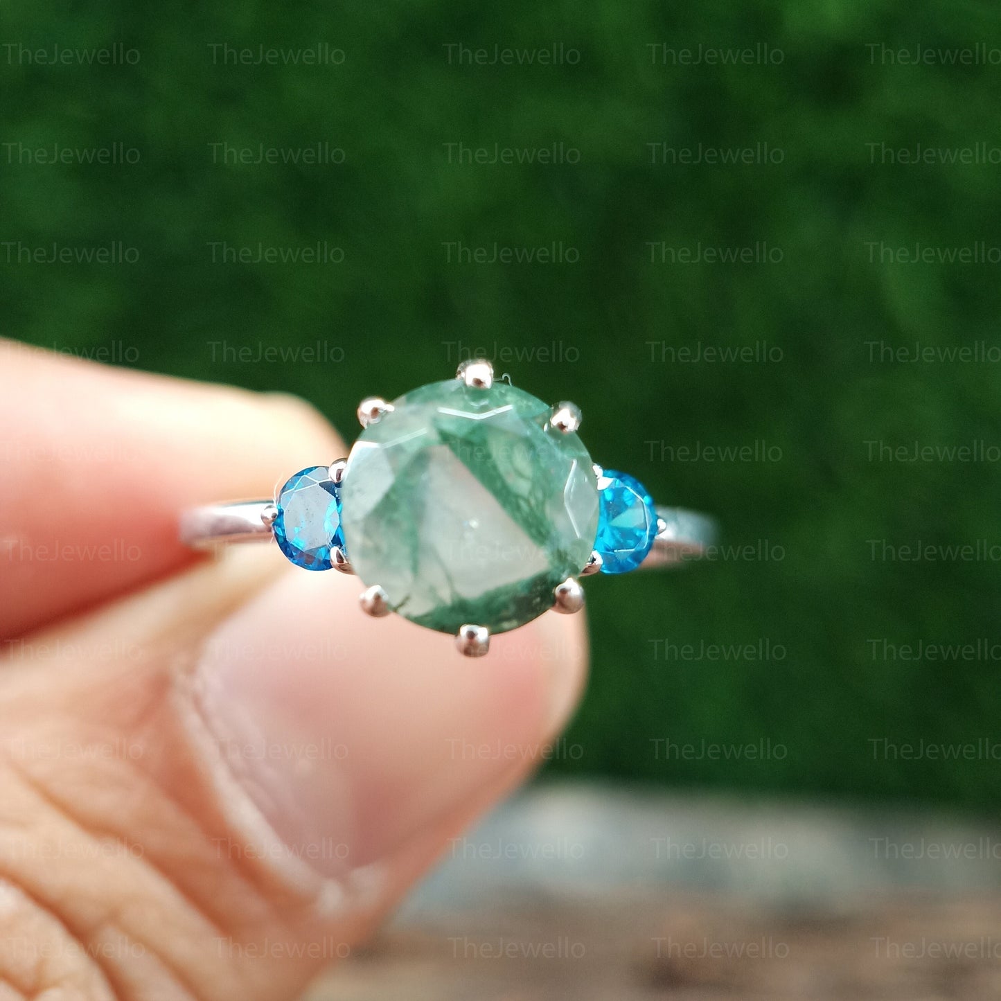 Round Mossagate Engagement Ring, Green Agate Wedding Ring, Solid 14k White Gold Ring, Three Round Moss Agate Ring