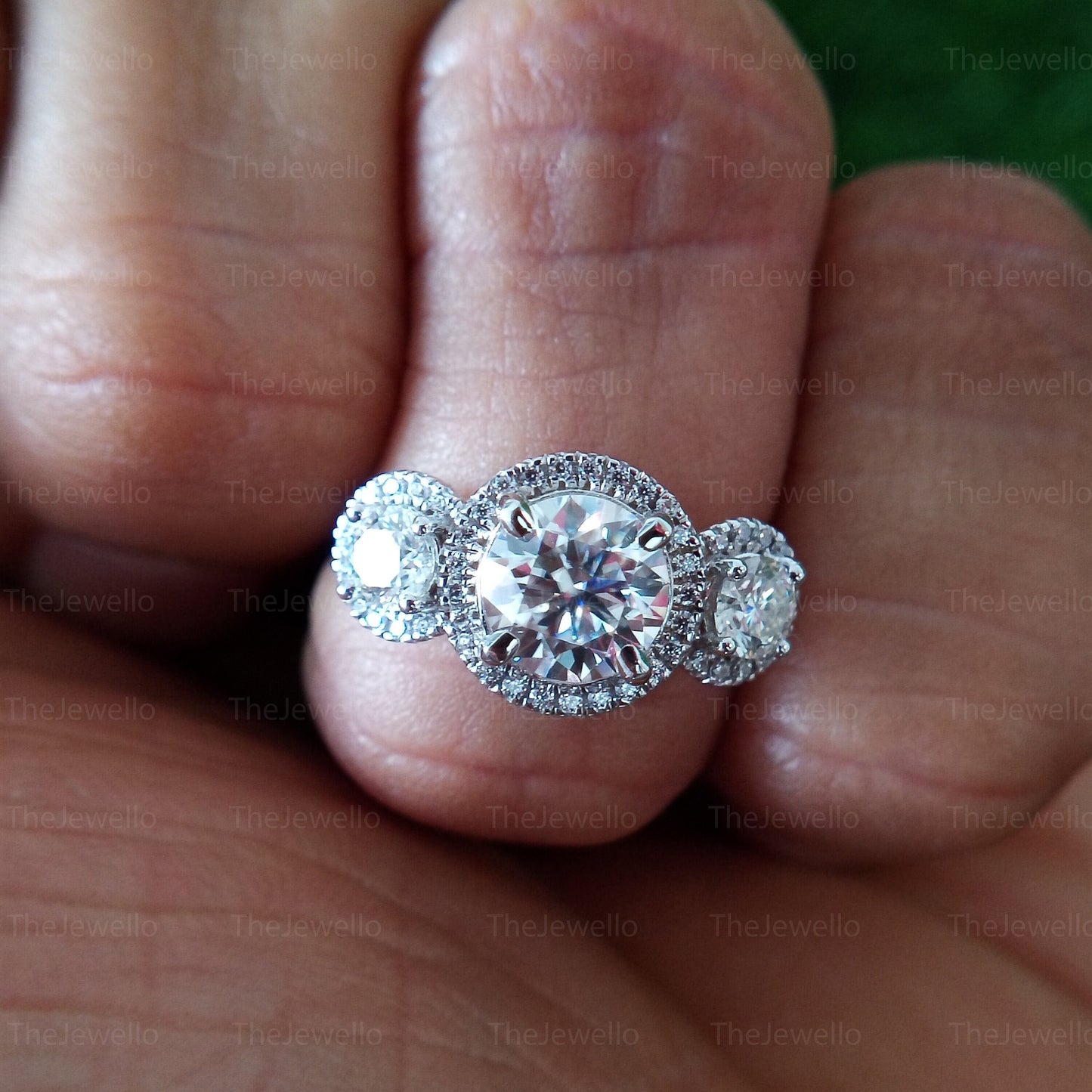 Three Stone Round Moissanite Ring Round Halo Style Engagement Ring Solid Real White Gold 3 Stone Ring Wedding Anniversary Ring