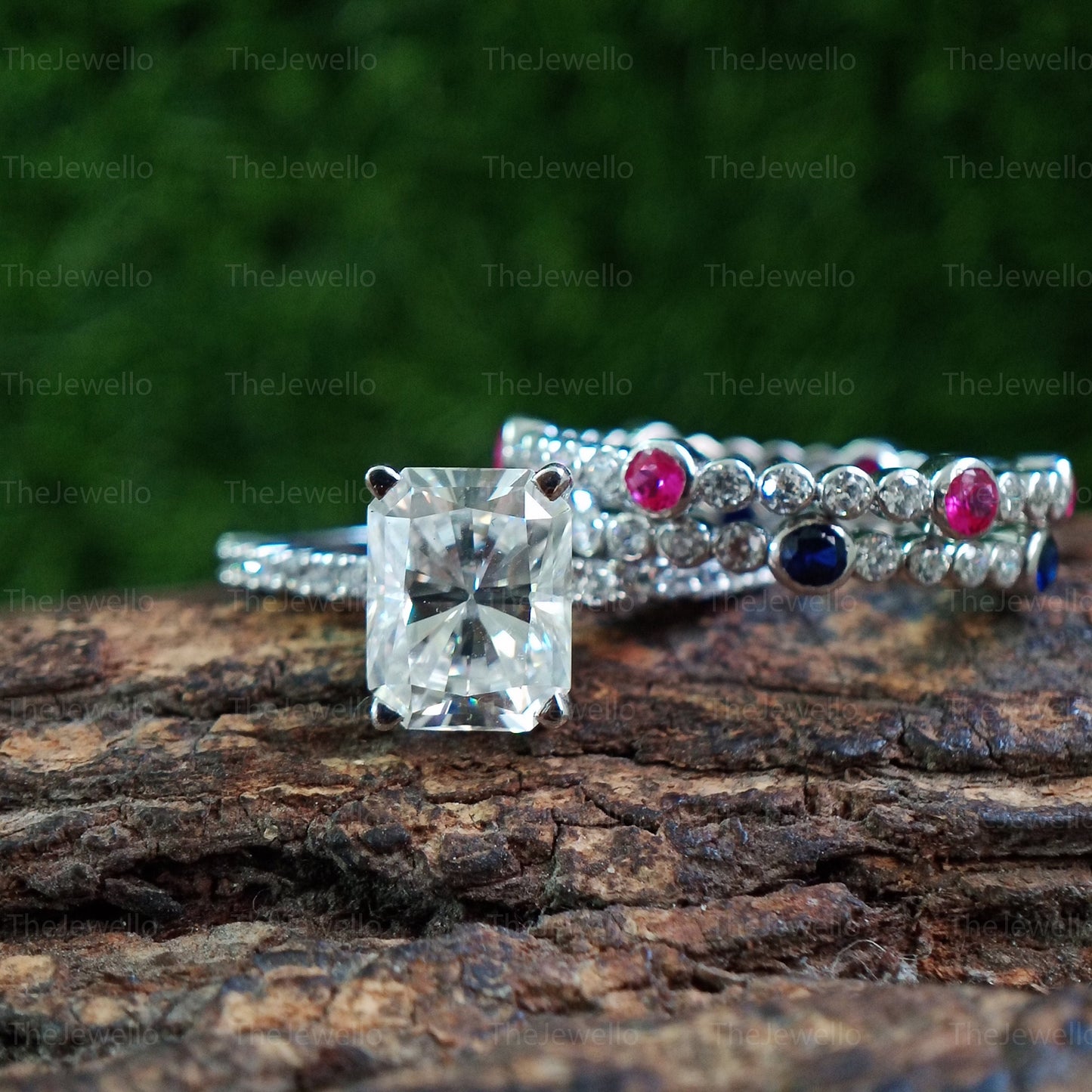 Unique Vintage Style Moissanite Bridal Ring Set, 10k/14k Gold Radiant Cut Engagement Ring with Full Eternity Wedding Band, 3pcs Ring Set